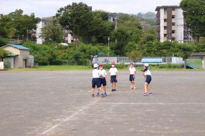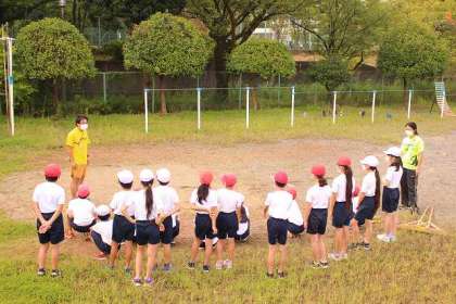 「立ち幅跳びから走り幅跳びへ」これからの学習の流れを確認しました。2つのグループに分かれて「立ち幅跳び」・「ゲームを楽しむ」に取り組みました。