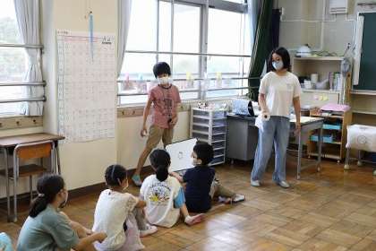 6年生がリーダーとなり、進行します。3班「絵の伝言ゲーム」、4班「じゃんけん列車」を楽しみました。