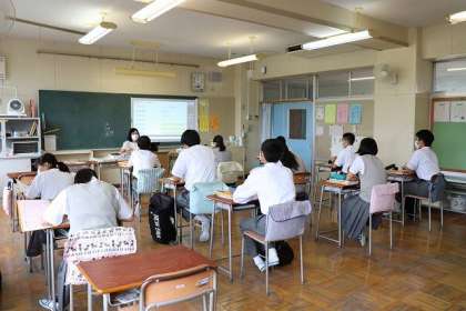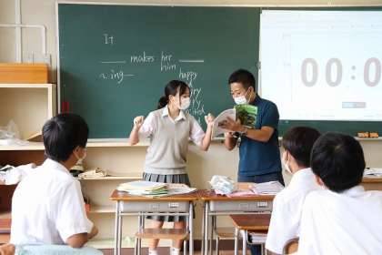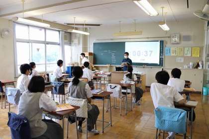 ジェスチャーゲームを楽しんでいます。もちろん、英語で答えています。こちらのクラスでは、英単語の復習をしています。