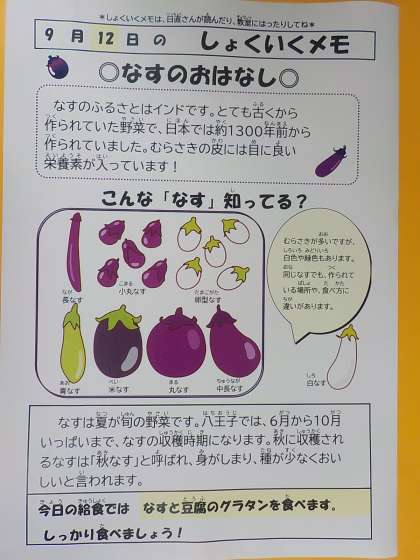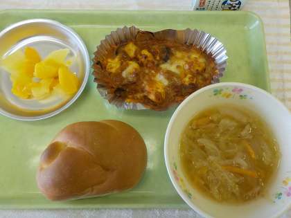 今日の献立:ミルクパン、なすと豆腐のグラタン、ジュリエンヌスープ、フルーツ缶、フレンチきゅうり