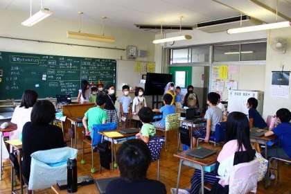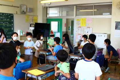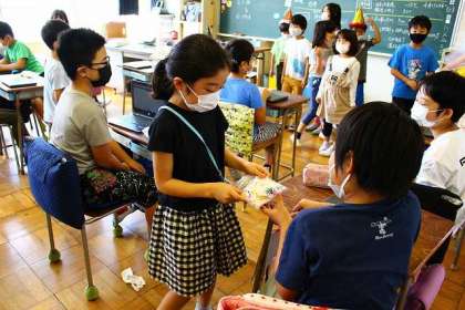 本番では5年教室で、練習の成果を見せてくれました。手作りの「てるてる坊主」を渡しました。