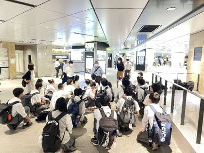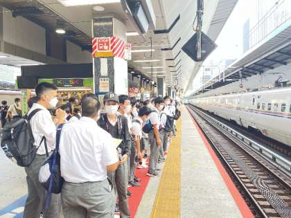 東京駅、丸の内南口団体待合所で開校式。看護師さん、添乗員さんよろしくお願いします。