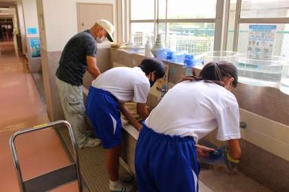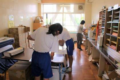 受け入れ先の都合で、職場訪問ができない生徒2名が本校舎でお手伝いをしてくれました。ラミネート作業、教室内の扇風機の清掃など。ありがとうございました。