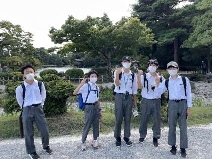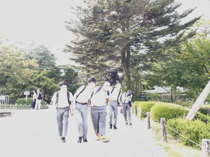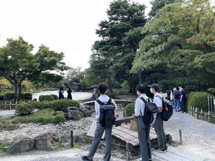 名勝、兼六園にて。「歩き疲れました〜」との声が。ゴールの金沢城はもうすぐそこです。