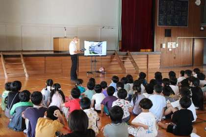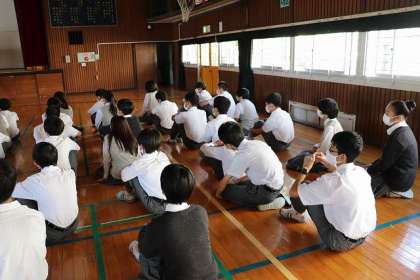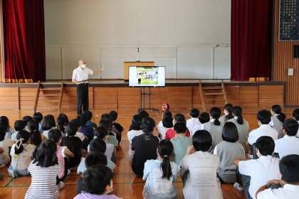『中学部3年の金沢修学旅行を終えて』映像とともに紹介していただきました。熱心に聴き入る中学部3年生(思い出しますね)、聴き入る小学生(映像が鮮明で感激です