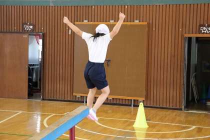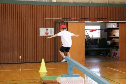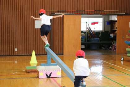 平均台を使って「ジャンプ」。スムーズに歩き、高さの最高地点から「ジャンプ」します。上達しているのに驚きました。