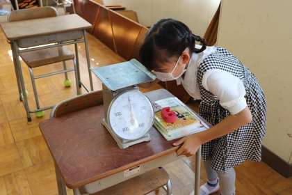 こちらのクラスでは「本・筆箱・教科書」の重さを計っています。