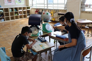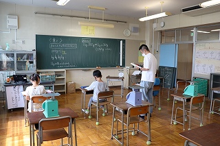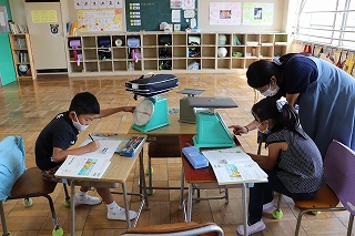 『重さ』の学習です。きょうは、重さの単位kgについてです。kgを使って重さを表すことができことがねらいです。「えっと、重いものは?」かばん・習字道具など。