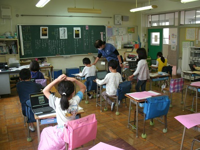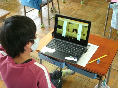「まず」、「つぎに」といった、順序を表す言葉の学習。一人一台のパソコンも活用しながら学習を進めています。