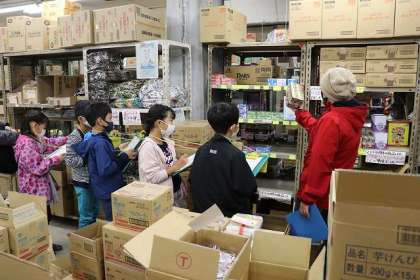 次は、日用品・お菓子コーナーです。「このように袋にたくさん入っています」うまい棒やチョコボールなど。
