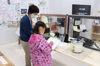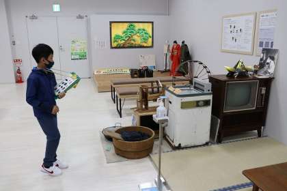 体験コーナーでは大喜びです。「昔の洗濯機・テレビ」「電気釜」の説明に聴き入る子どもたち、素晴らしいです。