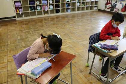 漢字の学習です。書き順を確かめています。集中しています。