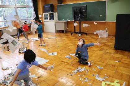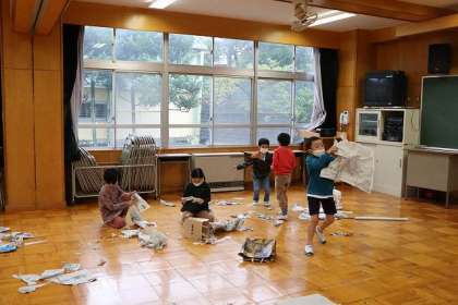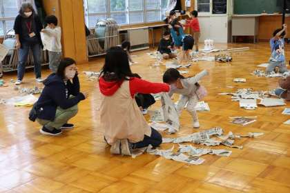 『やぶいたかたちからみつけたよ』紙をちぎったり破いたりしています。