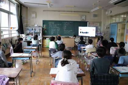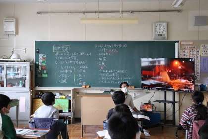 「自然災害」についての学習です。動画ではマンホールが浮き上がってる様子に見入っています。