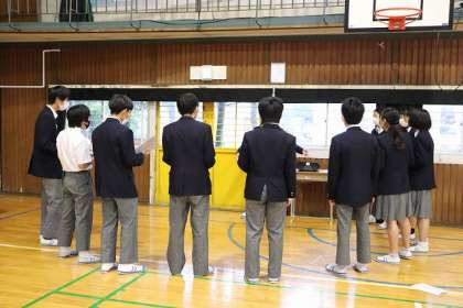 体育館での「学年練習」です。屋根に落ちる雨音にも負けず、声の響きを感じます。