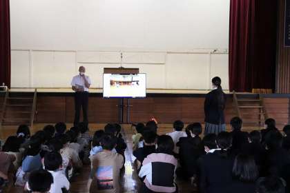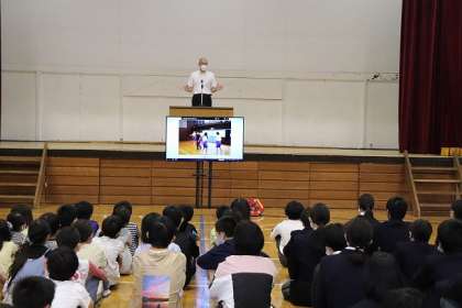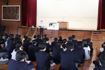 校長先生のお話「中学部1年生と『八王子盲学校』の先生による体育の授業の様子について・・アイマスクをつけての運動(声をかけることの大切さ)、フロアバレーボール体験」をスライドで分かりやすく説明してくださいました。中学部1年生の生徒からの感想も聞くことができました。