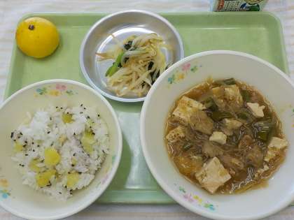 今日の献立:さつまいもご飯、肉豆腐、もやしの辛し和え、くだもの