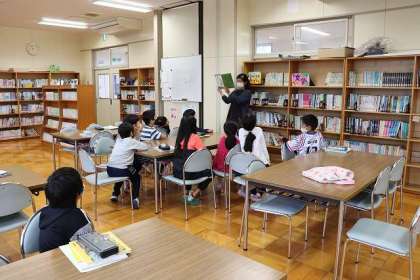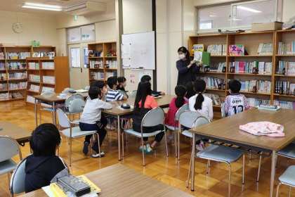 学校司書の先生による「本の読み聞かせ」の時間です。今日は「ねずみくんのチョッキ」の本を読んでくださいました。