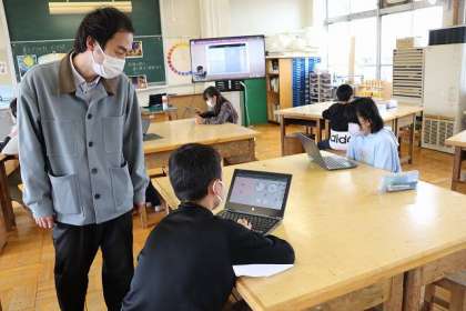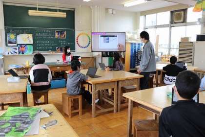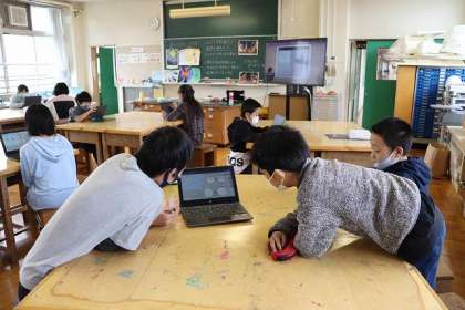 ICT支援員の方にも協力していただき、プログラミングで「動くもよう」をつくっています。