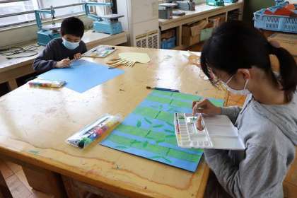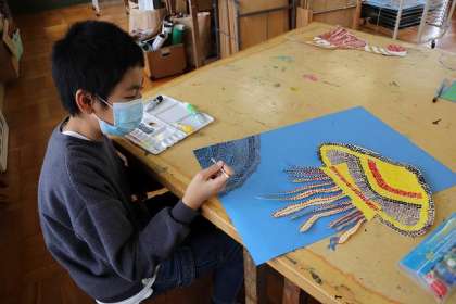 『アボリジナルアート』背景の模様を考え、絵の具をつけた綿棒で描いています。