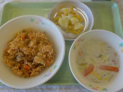 今日の献立:チキンライス、コーンポテト、白菜のクリームスープ