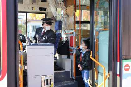場所を「川町車庫」に移して「バスの乗り方教室」のスタートです。