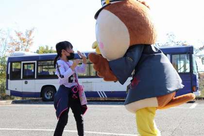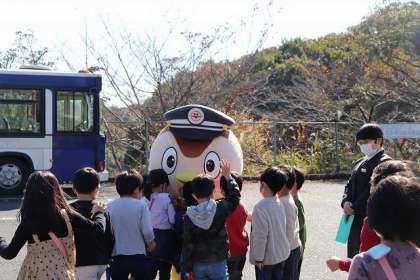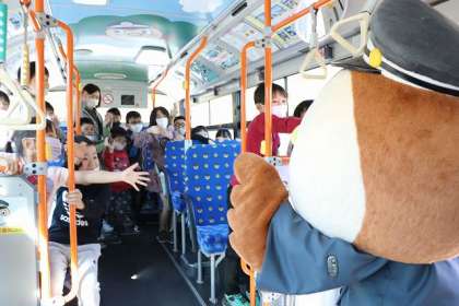 「にしちゅん」が登場! 子どもたち大喜び!! 子どもたちの歓迎に「にしちゅん」も勢いが出てきました。思わず車内まで登場です。