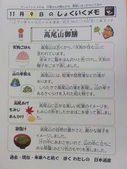今日の献立【高尾山御膳】:天狗ごはん、高尾揚げ、紅葉あんかけ、翠靄(すいあい)汁、山の幸和え