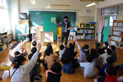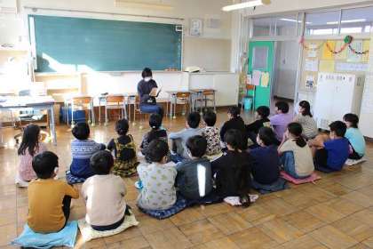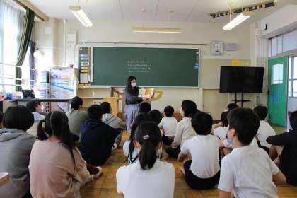 子どもたちが楽しみにしている企画です。低・中・高学年のグループに分かれて、担当の先生の『おすすめ本』を紹介してもらいます。読み聞かせを楽しみにしている様子が伝わってきます。