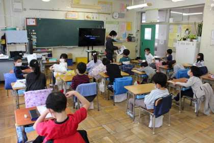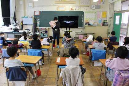 学級だよりを配布しています。バスの乗り方教室の写真をじっと見ている姿が印象に残りました。