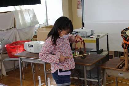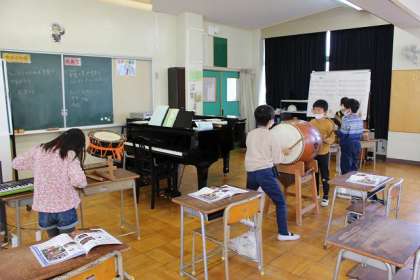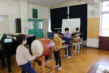 3階を歩いていると、太鼓の響きが音楽室から届いてきました。中に入ると演奏をしてくれました。