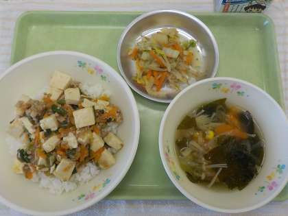 今日の献立:ごはん・マーボー豆腐、わかめとえのきのスープ、胡麻和え