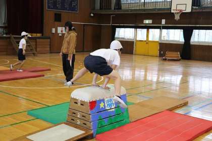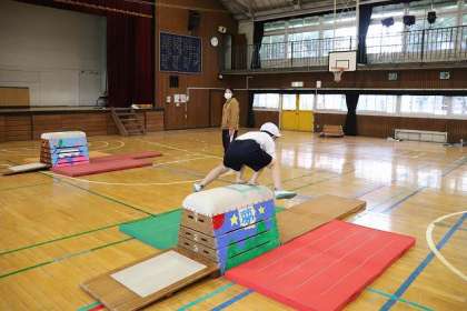 テープで囲んだ範囲内に手をついて跳ぶ練習をしています。