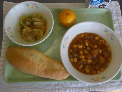 今日の献立:ソフトフランス、ポークビーンズ、雑魚サラダ、くだもの