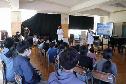小学部2、4、6年は「音楽室」にて応急処置訓練(「保健室にあるこれってなあに?」クイズからのスタートです。おおいに盛り上がっています。