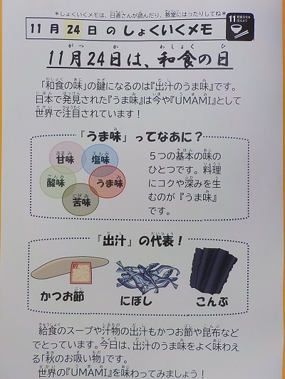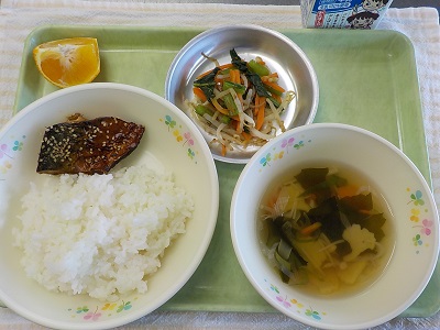 今日の献立【和食の日】:ごはん、さばのごま風味焼き、秋のお吸いもの、野菜のいろどり和え、くだもの