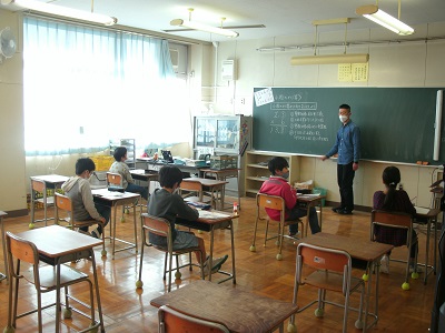 (3枚目)算数は少人数の2グループに分かれて、「少数のかけ算」の学習に取り組んでいます。
