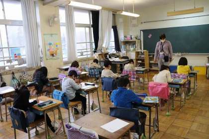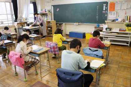 「漢字の練習をしましょう。」の声に、教室の後方に置いてあるプリントを取りに行く子どもたち。そして、静かにプリントに取り組んでいました。