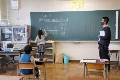 2つのクラスに分かれて「数直線を使って、分数の大きさを比べる」学習をしています。