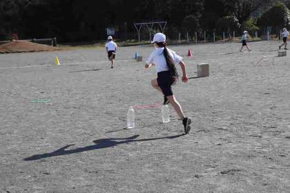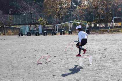 いろいろな道具を置いたコースの走り方を工夫し、全速力で走るにはどうしたらよいか考えて練習しています。