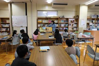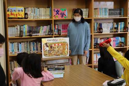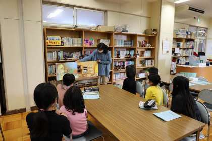 学校司書の先生による本の読み聞かせです。「どんぐりむらの ぱんやさん」の紹介です。