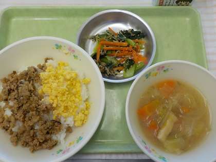 今日の献立:二色そぼろ丼、具だくさんの味噌汁、小松菜とじゃこ炒め