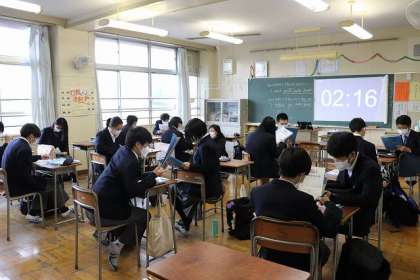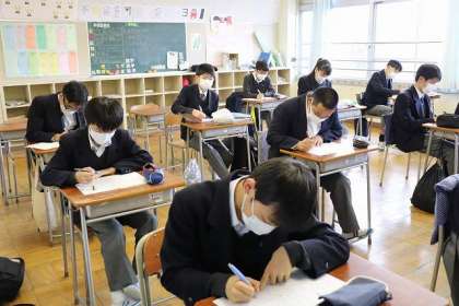 受験によく出る英単語の学習をしています。ペアで英会話の練習もしています。