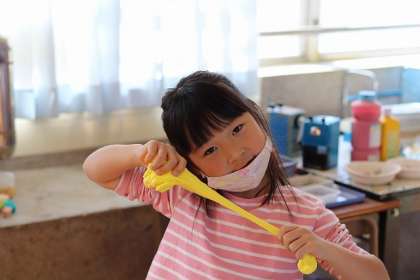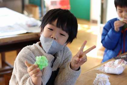 『フルーツパフェ』粘土でパフェの中身を作ります。