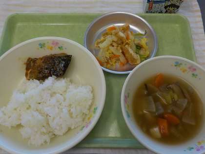 今日の献立:ごはん、鯖の胡麻味噌煮、けんちん汁、ピリ辛白菜