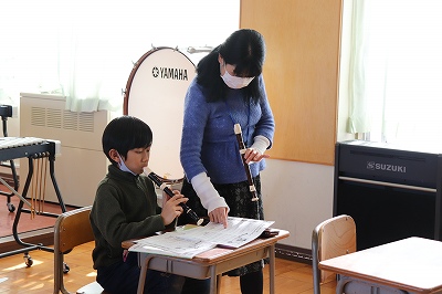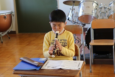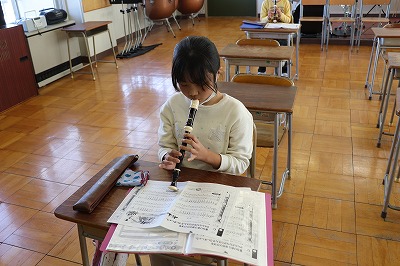 リコーダー練習です。低い「ド」と「レ」の音を運指や息の強さに気を付けて吹いています。