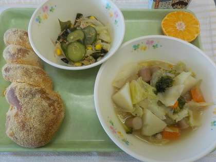 今日の献立:きなこ揚げパン、ウインナーポトフ、わかめとツナのサラダ、くだもの