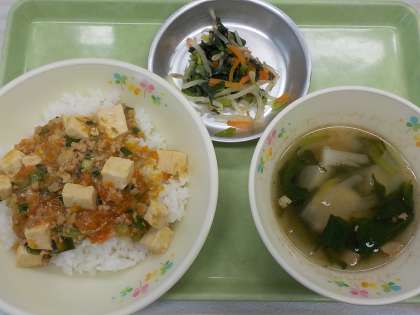 今日の献立:ごはん、マーボー豆腐、三色ナムル、かぶのスープ