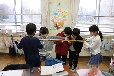 両手を広げた長さをはかっています。
