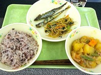 今日の献立:大豆ピラフ、チキンの香草パン粉焼き、オニオンスープ、くだもの